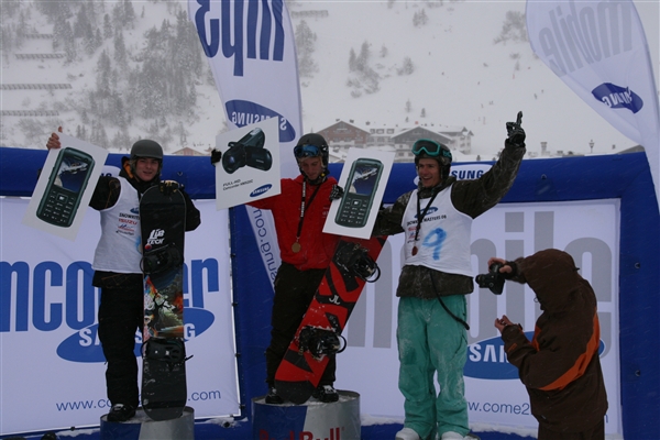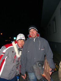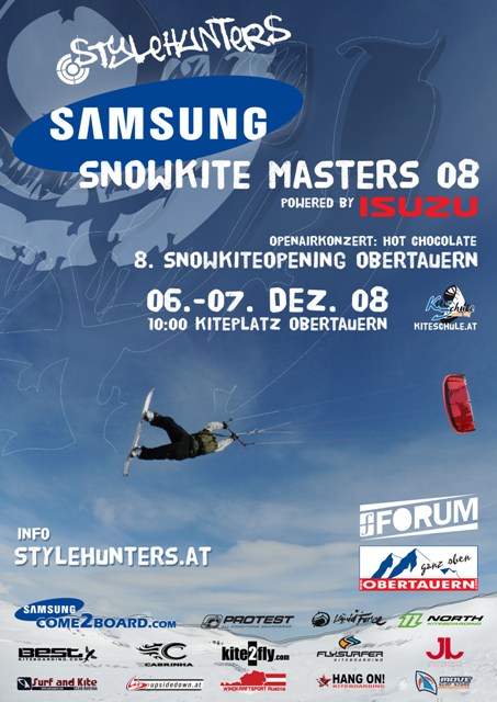 Last weekend my girfriend and I drove to Obertauern to the SAMSUNG Snowkite Masters 08 powered by ISUZU. It was snowing almost the whole weekend and so we had masses of snow… The first of the two days we had not enough wind - so we decided to go for some skiing and snowboarding. I teached Carina how to snowboard and we chilled and had a nice time in the mountains. On Sunday it got windy. It was snowing like hell and the police almost won’t let me up the mountain because the road was closed. After some dicussions we made it just in time. Carina and I pumped up my 13 Prima Donna as fast as possible and when we got everything done my heat started. Due to the bad wind on friday and saturday it was my first time to snowkite. After some troubles I got into it more and more and so I could win some heats and got into the final. At the end I got 2nd which makes me really happy… I won a cool Mp3 player from Samsung and had a lot of fun on the snow. The winner of the event was my JN teammate Heinar Brandstötter.